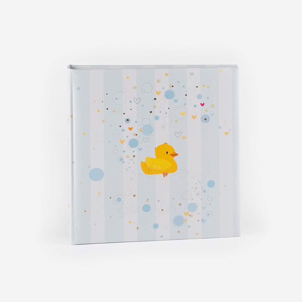 A capa dos Álbuns Analógicos Infantis possui uma impressão artística com relevo dourado e estão disponíveis em azul e Rosa.